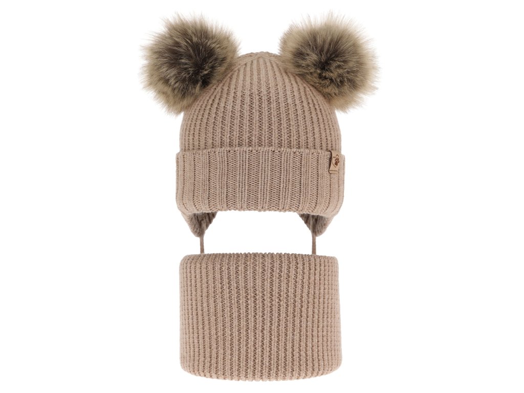 Výnimočná čiapka s dvomi pompónmi púta pozornosť roztomilým vzhľadom a praktickým riešením v podobe šnúrok, ktoré zaisťujú stabilné umiestnenie na hlave počas zimných radovánok. Celok dopĺňa štýlová nášivka, dodávajúca súprave exkluzívny charakter.