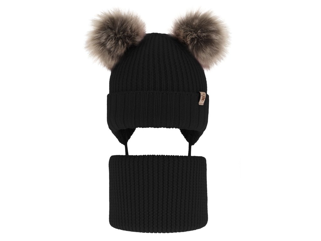 Výnimočná čiapka s dvomi pompónmi púta pozornosť roztomilým vzhľadom a praktickým riešením v podobe šnúrok, ktoré zaisťujú stabilné umiestnenie na hlave počas zimných radovánok. Celok dopĺňa štýlová nášivka, dodávajúca súprave exkluzívny charakter.