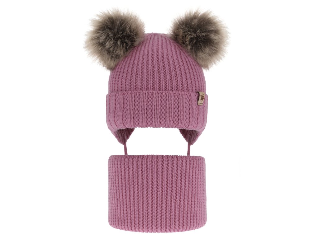 Výnimočná čiapka s dvomi pompónmi púta pozornosť roztomilým vzhľadom a praktickým riešením v podobe šnúrok, ktoré zaisťujú stabilné umiestnenie na hlave počas zimných radovánok. Celok dopĺňa štýlová nášivka, dodávajúca súprave exkluzívny charakter.