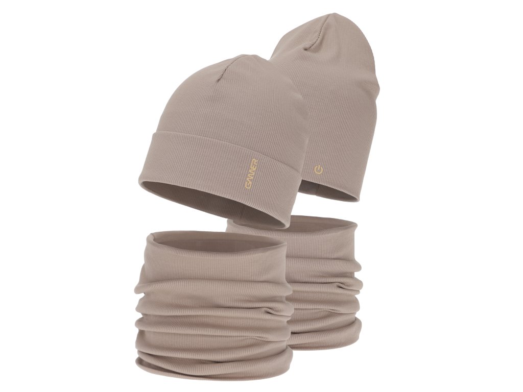 Komplet je vyrobený z vysokokvalitnej bavlny, ktorá tvorí až 92% zloženia materiálu. Bavlna je prírodný materiál známy svojou priedušnosťou, mäkkosťou a príjemným pocitom na pokožke. Pridanie elastanu zabezpečuje perfektnú elasticitu, vďaka ktorej sa čiapka a tunel dokonale prispôsobia tvaru hlavy a krku. Rebrovaný úplet dodává kompletu elegantný vzhľad a zároveň zvyšuje jeho funkčnosť.