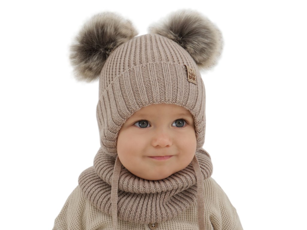 Charakteristické dva brmbolce vyrobené z mäkkej eko kožušiny dodávajú čiapke roztomilý vzhľad, zatiaľ čo rebrovaná štruktúra prináša módny akcent. Bavlnené podšitie čiapky poskytuje dodatočnú ochranu pred vetrom a zvyšuje komfort nosenia, čím eliminuje riziko podráždenia pokožky.