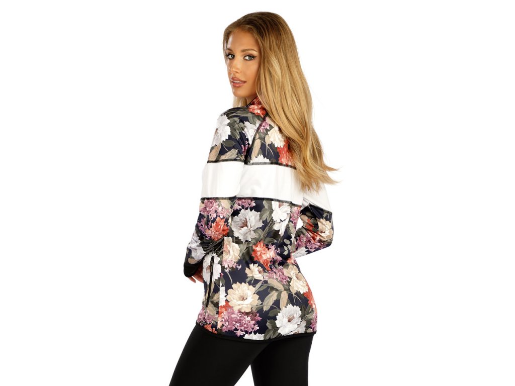 Mikina dámska s kapucňou na zips. Zapínanie a vrecká na zips. Manžetové rukávy s otvorom na palec. Efektívne členenie s plochými švami pre pohodlné nosenie. Mikina v kombinácii s veľmi pružným funkčným materiálom je vhodná najmä na športové aktivity. Originálny vzhľad s krásnou kvetinovou potlačou osvieži váš šatník.